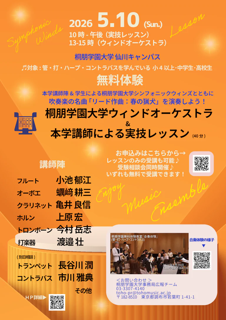 朋と深く、朋と広く。 2025年度 冬期講習について(大学受験コース:12/20-21開催) 大学・大学院 入試情報:入試要項、学費、過去問題、奨学金など <2026年度新設>大学院修士課程・ソルフェージュ教育コースについて 学校案内(2026入試向け) <2025年度より専門領域を拡大>音楽学部・作曲専攻 編作芸術コース 、大学院音楽研究科・作曲コース〔編作芸術〕Music and Sound Design 鑑賞する 12月 2025 17 ( WED ) 第35回 Symphonic Winds 演奏会 杉並公会堂 大ホール (荻窪) 9:45 開演 音楽部門 大学・大学院 高校 主催公演 1月 2026 9 ( FRI ) 合唱の夕べ 調布市文化会館たづくり2F くすのきホール (調布) 9:30 開演 音楽部門 大学・大学院 主催公演 演奏会情報をすべて見る 見学する イベントをすべて見る 2026年1月17日開催 桐朋学園声楽無料体験レッスン 音楽部門 大学 高校 イベント お知らせ ソリスト・ディプロマ公開試験 大学 イベント お知らせ 大学院修士課程 中間演奏発表 大学・大学院(修士) イベント お知らせ 2025年度「桐朋学園大学ジュニア ウインド オーケストラ」第2期 後期メンバー募集 2025年 秋!地域や学校を超えて集まるジュニアの仲間と、桐朋学園大学講師・在学生メンバーの指導・協力によるウィンドオーケストラで夢を叶えよう!こちらのフォームからお申込みください。2025年度「桐朋学園大学ジュニア ウインド オーケストラ」 メンバー応募 フォーム 大学 高校 イベント イベントをすべて見る 人を知る 教員一覧 すべての教員を見る 卒業生インタビュー すべて見る 桐朋学園大学ソリスト・ディプロマコース在籍 亀井 聖矢 お知らせ すべてのお知らせを見る 12 . 5 . 2025 2026年1月17日開催 桐朋学園声楽無料体験レッスン 音楽部門 大学 高校 イベント お知らせ 12 . 1 . 2025 桐朋学園大学 【チェンバロ】非常勤講師募集要項 音楽部門 大学 お知らせ 採用情報 11 . 30 . 2025 2026年度 科目等履修生、オープン・カレッジ「指揮コース」の募集要項を公開しました 音楽部門 大学 お知らせ 入試関連情報 10 . 28 . 2025 【第94回日本音楽コンクール】ピアノ・バイオリン・オーボエの各部門で本学の学生生徒が入賞しました。 音楽部門 大学 高校 オーケストラ・アカデミー お知らせ 桐朋生の活躍 すべてのお知らせを見る