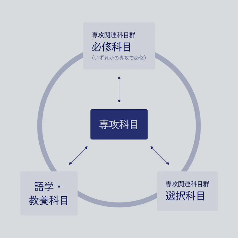 専攻科目群を中心として他の科目群を配置する、コアカリキュラム的な考え方をとっている。