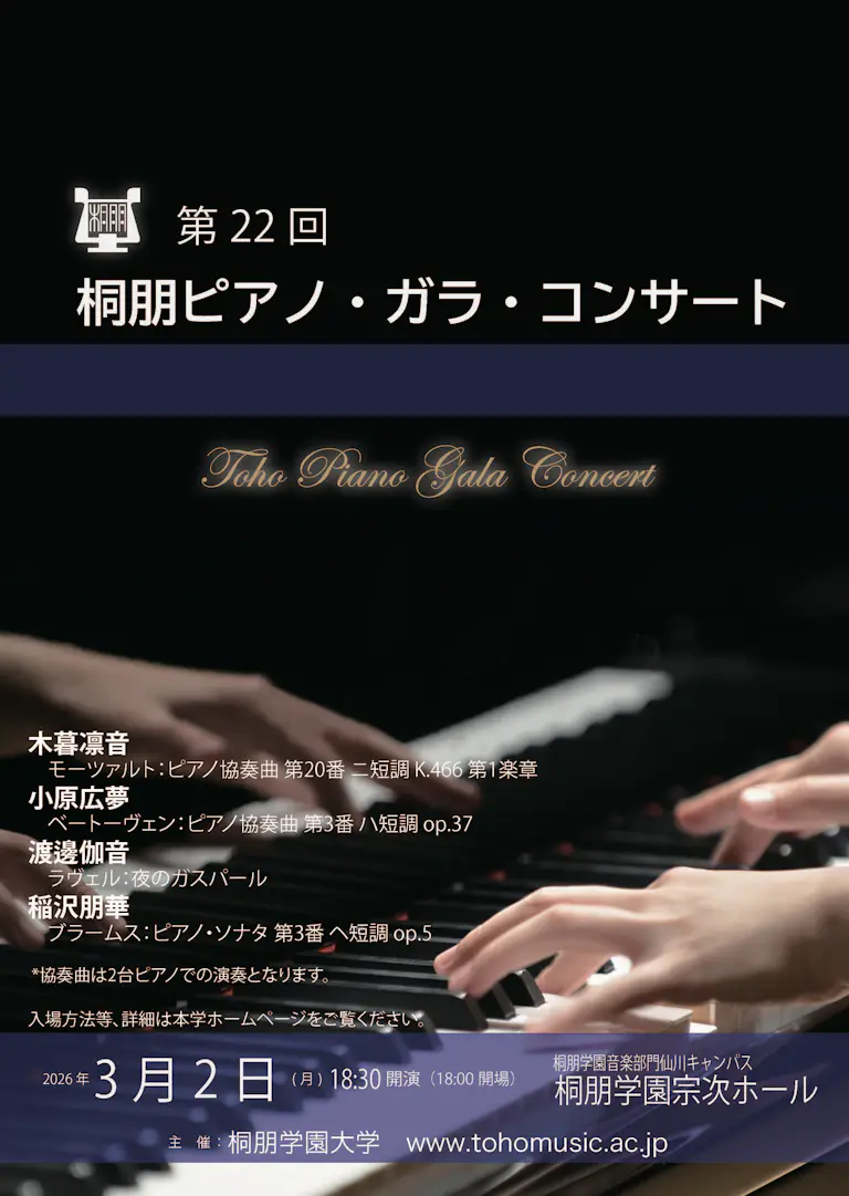 演奏曲目 | W.A.モーツァルト:ピアノ協奏曲 第20番 ニ短調 K.466 第1楽章 ピアノ/ 木暮凛音 (小5) 共演者 / 久保山菜摘 ベートーヴェン:ピアノ協奏曲 第3番 ハ短調 op.37 ピアノ/ 小原広夢 (大4) 共演者 / 菊野惇之介 ラヴェル:夜のガスパール ピアノ/ 渡邊伽音 (大3) ブラームス:ピアノ・ソナタ 第3番 ヘ短調 op.5 ピアノ/ 稲沢朋華 (大4) *協奏曲は2台ピアノでの演奏となります。 |