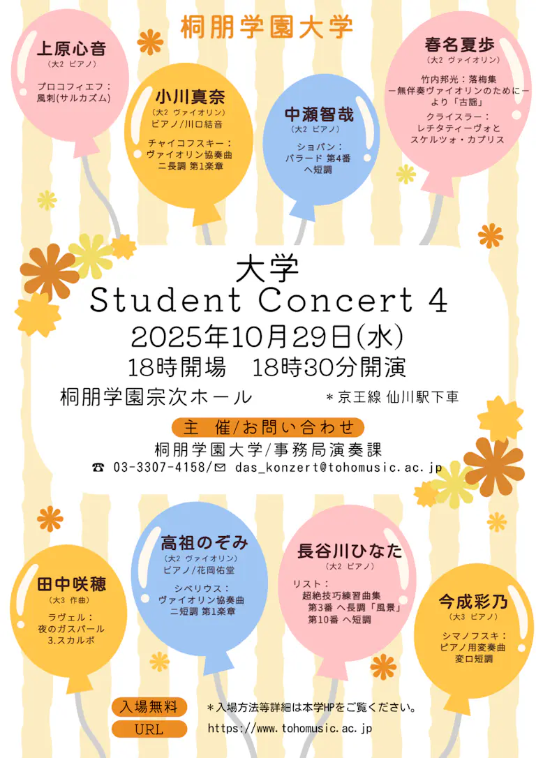 出演者 | 出演予定者 (演奏順) 2) 川口結音 (大2 ピアノ) 4) 中瀬智哉 (大2 ピアノ) 6) 田中咲穂 (大3 作曲) 7) 高祖のぞみ (大2 ヴァイオリン) 7) 花岡佑堂 (大2 ピアノ) 8) 今成彩乃 (大3 ピアノ) |