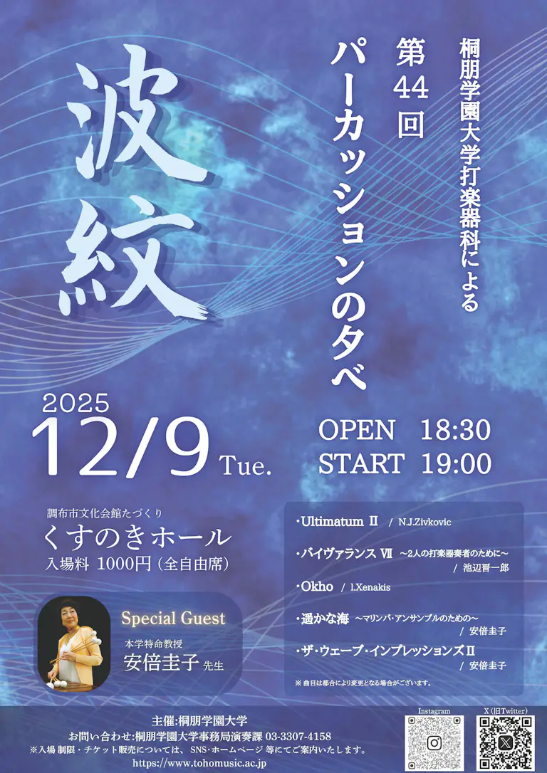 出演者 | 本学打楽器およびマリンバ専攻生 安倍圭子 (本学特命教授) |