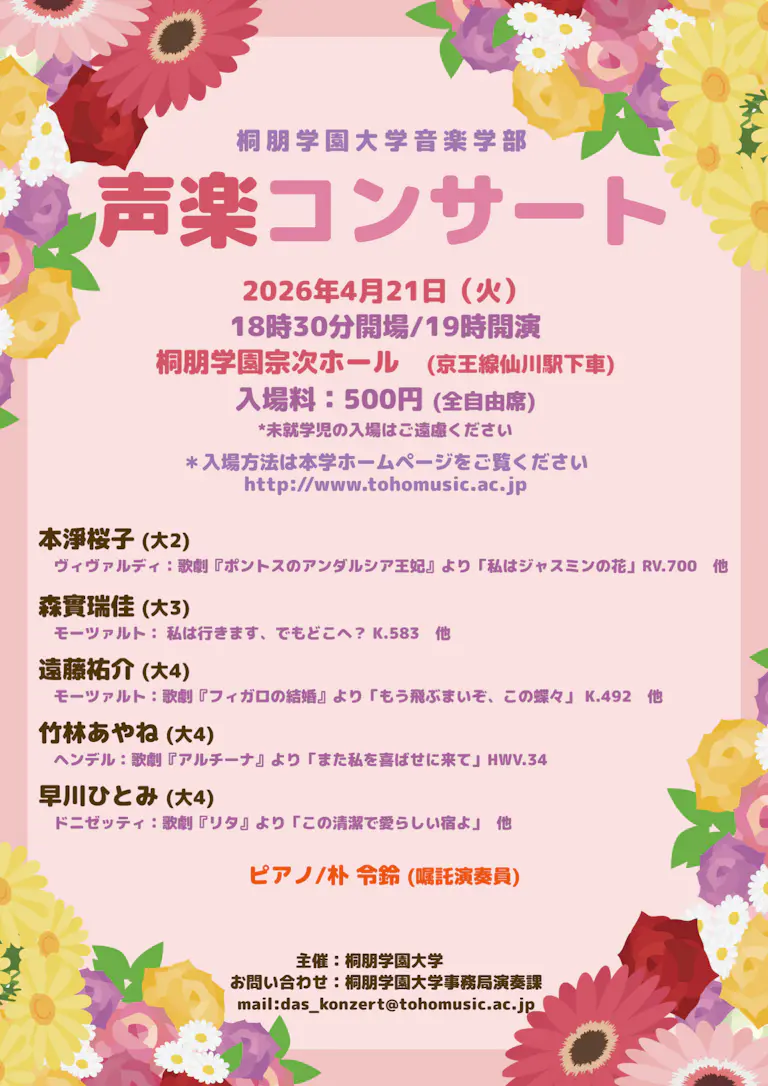出演者 | 本淨桜子(2年) ヴィヴァルディ:歌劇『ポントスのアンダルシア王妃』より「私はジャスミンの花」RV.700 他 森實瑞佳(3年) モーツァルト:私は行きます、でもどこへ? K.583 他 遠藤祐介(4年) モーツァルト:歌劇『フィガロの結婚』より「もう飛ぶまいぞ、この蝶々」 K.492 他 竹林あやね(4年) ヘンデル:歌劇『アルチーナ』より「また私を喜ばせにきて」HWV.34 他 早川ひとみ(4年) ドニゼッティ:歌劇『リタ』より「この清潔で愛らしい宿よ」 他 ピアノ:朴 令鈴(嘱託演奏員) |